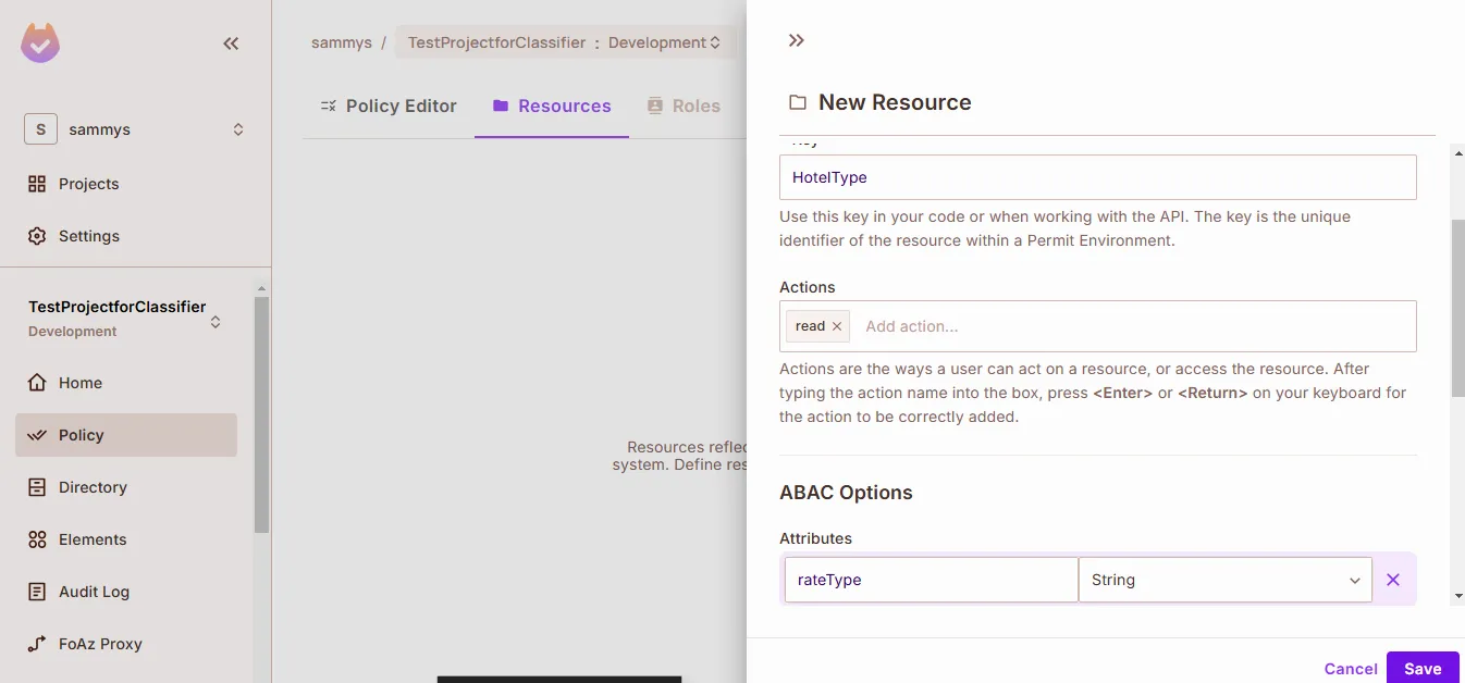 - Go to Policy → Resources and define each resource type along with any relevant attributes.